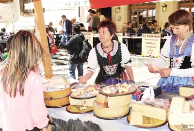 5月6日,在瑞士格律耶尔,当地民众向游客介绍格律耶尔奶酪。当天,瑞士佛里堡州中世纪小镇仙鹤堡——格律耶尔举行奶酪节,展示瑞士著名特产格律耶尔奶酪。 新华社发