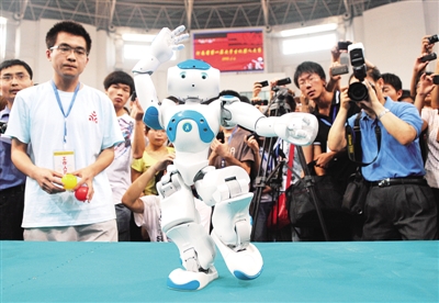 5月6日,在河南省第一届大学生机器人大赛开幕式上,一个机器人正在表演太极拳。当日,由河南省通信学会和郑州大学联合主办的“华大杯”河南省第一届大学生机器人大赛开赛。 新华社记者 李 博摄