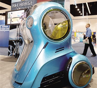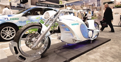 第26届世界电动车大会5月6日在洛杉矶会展中心开幕。来自美国、中国、德国、英国、日本等十几个国家和地区的电动车及相关企业和该领域专家、研究人员参加了这一电动车行业的盛会。 上图 西门子公司展示电动智能摩托车Smart Chopper。 左图 通用公司展示城市电动概念车。 新华社发