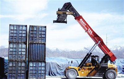5月9日,一辆集装箱装卸吊车准备搬运集装箱。作为青海、西藏唯一的铁路交通大动脉——青藏铁路,大大提高了沿线矿产资源的开发利用。据统计,2011年,仅柴达木循环经济试验区内,青藏铁路外运钾肥、原油、纯碱等大宗原材料产品超过2000万吨,预计到“十二五”末,这一数字将超过6000万吨。 新华社记者 王 博摄