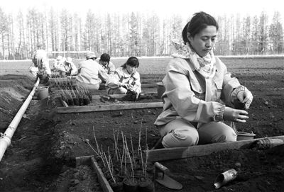 5月10日,在内蒙古呼伦贝尔盟乌尔旗汉林区,林区女工在职业技能比赛中进行育苗作业。当日,内蒙古自治区苗木育苗工职业技能比赛在内蒙古大兴安岭林区辖内的乌尔旗汉林业局举行,66名林业工人参加了现场苗木育苗作业与理论知识测试。 新华社记者 张 帆摄