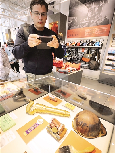 5月9日,在美国旧金山,一位游客在金门大桥访客中心内拍摄有关大桥的文物。 集咨询、展览和礼品销售于一体的金门大桥首个访客中心于5月8日起向公众开放。在新访客中心开放的同时,一座由金门大桥原礼品店改建的名为“圆房子”的建筑也开始启用。 新华社发