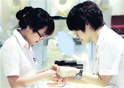 5月11日,北京菜百商场新光店,工作人员为消费者介绍金饰品。受国际金价大跌影响,京城黄金卖场近日纷纷下调了黄金价格,千足金每克降价10元,达392元/克。这是继3月7日金价下调以来今年第二次下调。 本报记者 赵 晶摄