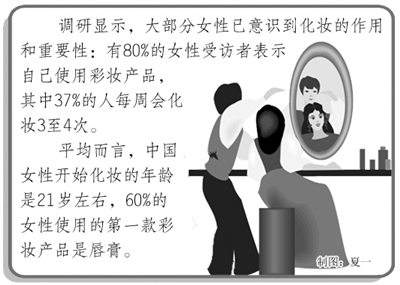 化妆在当今中国的普及程度如何?中国女性对化妆文化和化妆技巧的认知又是怎样?日前由法国益普索市场调研公司面向北京等全国8个大中型城市消费者发起的一项在线彩妆调研显示,彩妆已被认为是和服饰一起成为打造时尚形象最重要的两大元素之一。同时,高达93%的受访者表示,化妆能增加个人魅力,83%的受访者认为化妆提升个人自信,而79%的男性受访者表示化妆能增加对异性的吸引力。