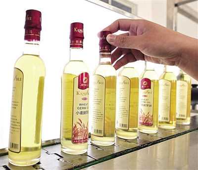 5月14日,山东省邹平县小麦胚芽油生产企业的工人正在检验产品。在邹平县孙镇,一家企业凭借自主研发的专利技术进行小麦深加工,打造了一条别具特色的小麦深加工之路。 董乃德摄(新华社发)