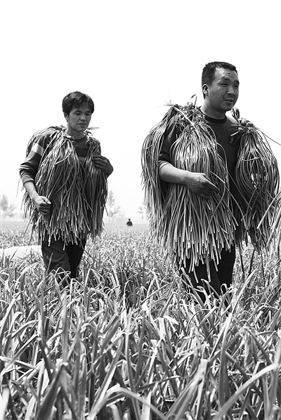 5月14日,河北省邯郸市永年县小龙马乡北护驾村村民在收获蒜薹。日前,河北省永年县蒜薹进入采收旺季,该县今年共种植大蒜15万亩,预计可产蒜薹9000万公斤。