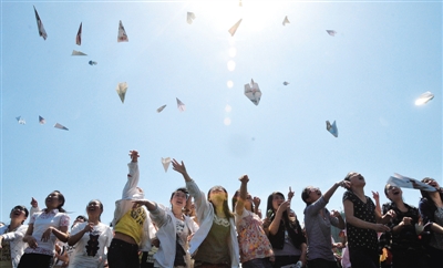 5月14日,四川省南充一中高三学生在操场上将写有梦想的纸飞机抛向空中。随着高考的临近,四川省南充一中针对高三学生开展多种游戏活动,让考生释放紧张心情,以自信乐观的心态迎接高考。 李向雨摄(新华社发)
