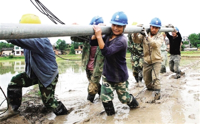 江西九江修水县供电公司工作人员抢修水毁供电线路。近日,受持续强降雨影响,九江市修水县配电网设备严重受损,造成多个乡镇电力供应全部中断。灾情发生后,江西修水县供电公司先后组织120人次的党员服务队和干部员工奋力抢修。截至5月14日早上8时,修水县所有受灾乡镇的1万余户居民全部恢复供电。 新华社发