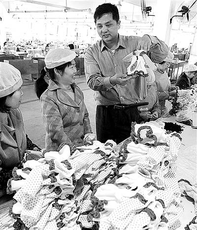今年42岁的江西峡江县仁和镇农民戴移胜,上世纪90年代期间先后到东莞、深圳几家外资企业打工学技术,2004年回到家乡创办峡江县忠信玩具有限公司,并陆续在全县每个乡镇设立了加工车间,解决了600余名下岗工人的就业问题,成为远近闻名的创业标兵。2008年他被授予“全国优秀农民工”称号。图为戴移胜(左三)指导水边镇彭家村刘正秀(左二)等员工生产。 新华社记者 宋振平摄
