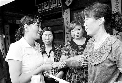 贵州省盘县乐民镇海子村村民徐敏(左一)拉着前来看望她的全国妇联干部赵丽荣的手久久不愿松开。“新农合”医疗为她治疗癌症报销了很大一部分医药费,解决了生活难题。 新华社记者 何俊昌摄