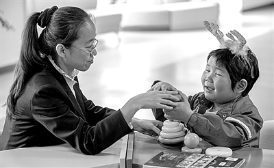 中国盲文图书馆盲童阅览区的胡梅老师(左)在与7岁的盲童易瑛琦互动。 新华社记者 李 鑫摄