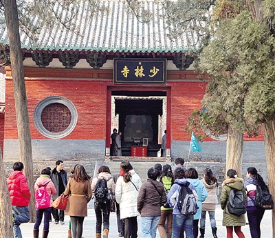 一个旅游团队在少林寺参观游览(2月16日摄)。在刚刚结束的国家旅游局专家组对少林景区的暗访复验中,少林景区以971分通过复核验收,“保牌”成功。 新华社记者 王 颂摄