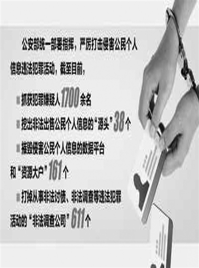 4月20日,经过4个多月连续奋战,在掌握确凿证据的基础上,公安部部署20个省区市公安机关开展集中行动,一举抓获侵害公民个人信息的犯罪嫌疑人1700余名,挖出非法出售公民个人信息的“源头”38个,摧毁侵害公民个人信息的数据平台和“资源大户”161个,打掉从事非法讨债、非法调查等违法犯罪活动的“非法调查公司”611个。