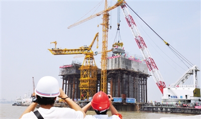 5月20日,武汉鹦鹉洲长江大桥2号主桥墩顺利完成首节钢塔的调装,这标志着这座世界跨度最大的三塔四跨悬索桥已全面完成桥墩下部结构施工,提前进入钢塔吊装施工阶段。武汉鹦鹉洲长江大桥位于武汉长江大桥上游2.3公里处,连接汉阳和武昌。其主桥长2.1公里,桥面宽38米,双向8车道,是迄今最宽的长江大桥。 新华社记者 熊金超摄