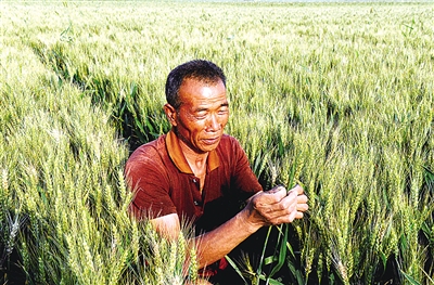 5月19日,河南新乡麦区农民陈道友在田间查看小麦的长势。时下正是小麦灌浆成长的关键时期,河南各地农业部门针对不同类型的麦田进行分类指导,引导农民加强田间管理。目前,河南全省8000多万亩小麦长势喜人。 新华社记者 朱 祥摄