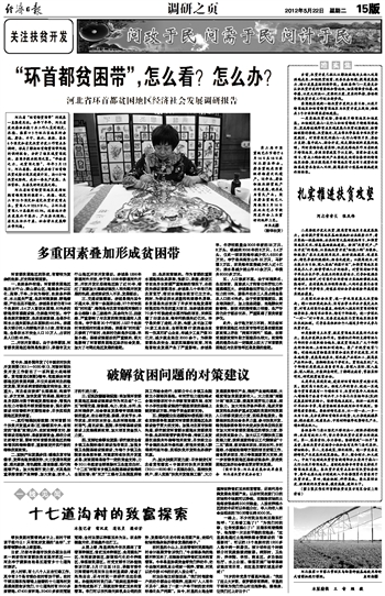 河北省“环首都贫困带”的现象一直很受关注。去年下半年,河北省发改委派出数十名工作人员到保定、承德、张家口3个环北京地区的赤城、蔚县、丰宁、涞水、涞源、易县6个国定和省定扶贫开发工作重点县调研,形成了解决环首都贫困带问题的调研报告,分析了该区域贫困现状、原因并提出脱困之策。“举全省之力,攻贫困之坚”,今年3月12日,河北省委、省政府启动了环首都扶贫攻坚示范区建设计划,决心打响扶贫攻坚战,走出一条生产发展、生活富裕、生态良好的发展之路。