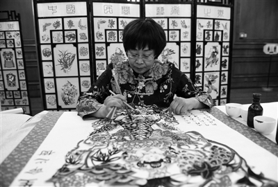 第三届中国剪纸艺术节将于6月16日至18日在河北蔚县举办。蔚县剪纸是国家级非物质文化遗产。近年来,蔚县积极扶持剪纸产业化发展,使其成为富民产业。图为蔚县剪纸艺人周淑英5月16日在此次艺术节新闻发布会上为剪好的纸样上色。