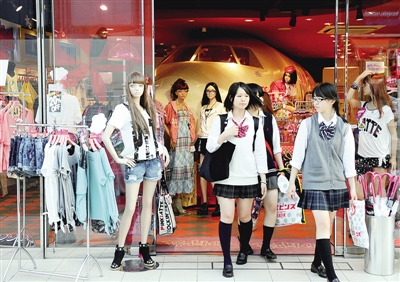 5月中旬,在日本首都东京,几名女孩在“竹下通”商店街购物。日本政府日前发表了5月份经济报告,日本经济从去年8月以来已经走出低谷,呈现缓慢持续复苏状况。日本内阁府公布数据称,扣除物价变动因素后的今年第一季度日本国内生产总值(GDP)环比增长1%,按年率计算增长4.1%。