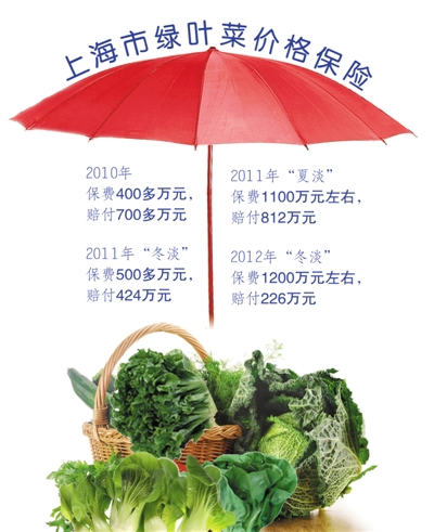 安信农险公司总裁助理石践介绍,此保险采用上海市统计局采集的18家标准菜场零售价格数据作为理赔标准,而保单约定零售价则为上海市统计局提供的前3年同期市场平均零售价。石践介绍,绿叶菜价格保险2010年保费400多万元,赔付700多万元;2011年“冬淡”保费500多万元,赔付424万元;2011年“夏淡”保费1100万元左右,赔付812万元;2012年“冬淡”保费1200万元左右,赔付226万元。