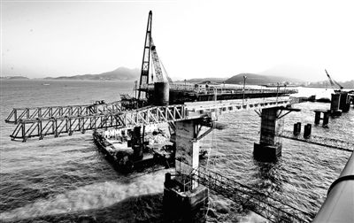 施工中的福建平潭海峡大桥复桥工程(5月21日摄)。截至目前,工程已完成施工投资6.5亿元,工程任务过半。大桥全长3504米,宽17米,单向3车道,将于2013年下半年建成通车。