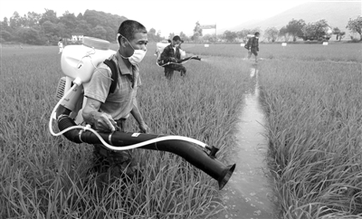 上图 5月18日,在广西柳州市融安县大良镇和南村,机防队员在早稻田里喷药防控病虫害。