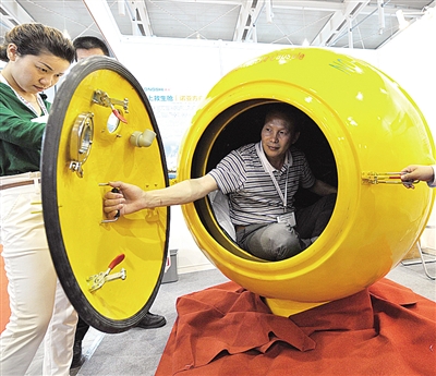 5月23日,参展企业工作人员在为观众演示“诺亚方舟”海上救生舱产品。当日,中国国际船舶工业博览会在南京开幕,吸引了荷兰、德国、韩国等多个国家展团,展会国际化程度不断提升。 新华社记者 孙 参摄