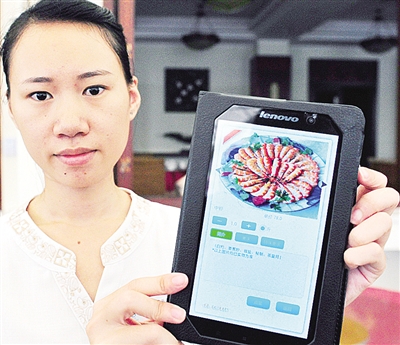 三亚市三亚湾一酒店工作人员展示手持点菜宝(5月22日摄)。海南三亚今年6月起将在海鲜排档市场全面开展信息化监管建设。为防止商家宰客,将使用iPad等设备进行“电子点菜”。 新华社记者 侯建森摄