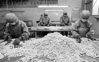 5月22日,山东省滨州市邹平县一家蔬菜加工厂的工人在分拣蒜粒。