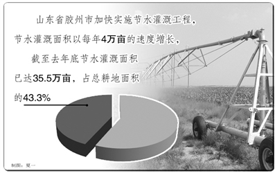本报讯 记者刘成、通讯员魏克举报道:山东省胶州市不断加大投资力度,加快实施节水灌溉工程,节水灌溉面积以每年4万亩的速度增长,截至去年底节水灌溉面积已达35.5万亩,占总耕地面积的43.3%。