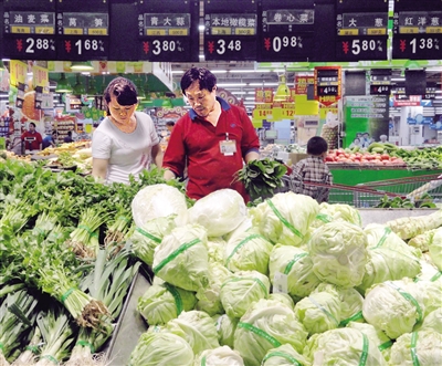 苏州市民在一家超市选购蔬菜(5月22日摄)。数据显示,5月份以来蔬菜价格下降明显,21种监测蔬菜全国日平均价格下降近10%。其中四季豆、黄瓜、豇豆价格下降尤为明显,降幅均已经超过20%。 王建康摄(新华社发)