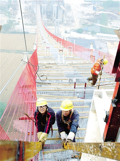 工人在安徽马鞍山长江公路大桥塔顶进行主体结构施工。目前大桥南北中三塔已成功封顶,正进行上部结构施工。 新华社记者 刘军喜摄