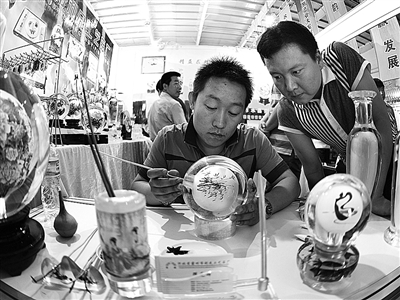 5月27日,河北霸州市利民工艺品厂工艺大师白旭光(中)正在现场作画。当日,首届中国霸州文化旅游产品交易会举办,来自全国各地的60多家文化旅游业企业参加此次交易会。 本报记者 李景录摄