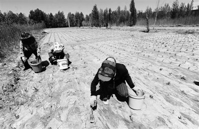 5月27日,格尔木市中心苗圃的几名工作人员在新疆杨树苗培育基地劳作。地处柴达木盆地腹地的青海省海西蒙古族藏族自治州格尔木市近90%的土地属于荒漠、半荒漠的戈壁滩,1954年以来,当地群众以“前赴后继、种树不止”的精神一直将植树造林作为改善自然条件、优化人居环境的重要工作。截至目前,格尔木市人工造林面积超过9万亩,生态环境建设及防沙治沙工作取得重要成果