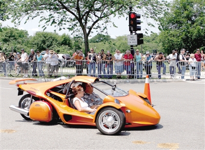 5月27日,一辆参加“滚雷”大巡游的改装摩托车行驶在华盛顿城区。 一年一度的“滚雷”摩托车大巡游当日在华盛顿举行。摩托车队成员主要是美国退伍老兵。 新华社发