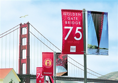 5月27日,在美国旧金山,金门大桥附近挂满庆祝通车75周年的彩旗。今年是金门大桥建成75周年,旧金山将为此举行一系列庆祝活动。 新华社发