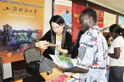 5月29日,在坦桑尼亚达累斯萨拉姆大学校内礼堂,当地学生向中国高校代表咨询赴中国留学事宜。5月29日,由中国国家留学基金管理委员会主办的为期2天的“2012中国高等教育展”在坦桑尼亚达累斯萨拉姆开幕,国内19所一流综合性、理工类、师范类、医药类高等院校组团参加了本届展会。 新华社发