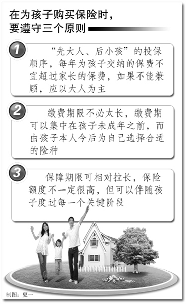 陈震英提醒家长,在为孩子购买保险时,要遵守三个原则。一是“先大人、后小孩”的投保顺序,每年为孩子交纳的保费不宜超过家长的保费,如果不能兼顾,应以大人为主;二是缴费期限不必太长,缴费期可以集中在孩子未成年之前,而由孩子本人今后为自己选择合适的险种;三是保障期限可相对拉长,保险额度不一定很高,但可以伴随孩子度过每一个关键阶段。