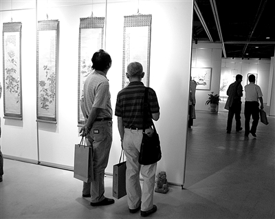 上图 人们在参观签约仪式现场展出的馆藏书画作品。