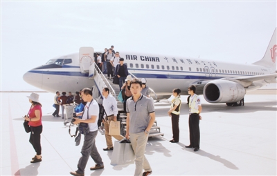6月2日,乘坐北京直飞敦煌客机的乘客抵达后走出机舱。当日上午,一架由北京直飞敦煌的波音737—800客机降落甘肃敦煌机场,这标志着北京—敦煌往返航班今年正式恢复开通。 张晓亮摄(新华社发)