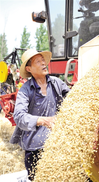 河南驻马店市确山县李新店镇武棚村,村民杨文忠看着粒粒饱满的小麦喜上眉梢。今年河南小麦种植面积7990万亩,目前全省自南向北已陆续开镰。