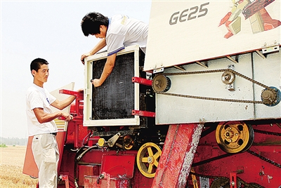 山东诸城市贾悦镇后徐宋村,福田雷沃重工“三夏生产服务队”正在为农机手李仁军(左)检修联合收割机。