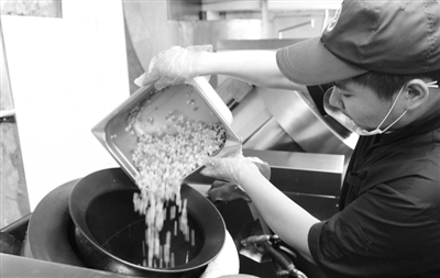 北京湘鄂情餐饮工作人员展示利用机器人炒菜制作学生餐。日前,知名餐饮品牌湘鄂情在京宣布进军学生餐市场,企业将采用全程冷链模式进行配送,使学生餐的品质大大提升。据介绍,全程冷链最大限度地保证了菜品的新鲜度,不会因为长时间密封运输而变质,食品安全系数大大提高。