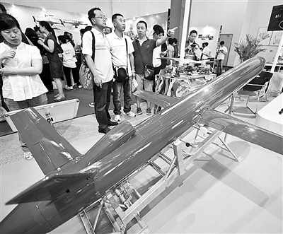 6月5日,参观者在第四届中国无人机大会暨展览会上观看无人靶机。当日,为期3天的第四届中国无人机大会暨展览会在北京展览馆开幕。来自国内外的航空、航天、兵器、船舶等行业的70余家单位展示了无人飞行相关技术和产品。 王京生摄(新华社发)
