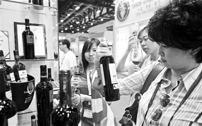 6月4日,观众在第三届中国(北京)国际葡萄酒博览会上看一款葡萄酒。