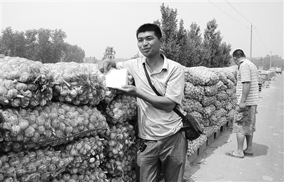从5月份开始,山东省金乡县鸡黍镇单楼村38岁的单海洋就没有闲过,先是忙着请人从自家地里收获大蒜,后来又忙着筹款到各地收购大蒜,算是一个亦农亦商的“农商”。6月2日,记者见到这位“农商”的时候,他正守在鸡黍镇的道路旁,道旁堆满了收购来的大蒜。他正等着更大蒜商出好价钱收购这些大蒜,也希望有蒜农向他出售大蒜。