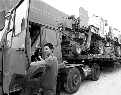 5月26日,山东省诸城县贾悦镇后徐宋村,4台收割机正在集中被运往河南省新野县参加麦收跨区作业。