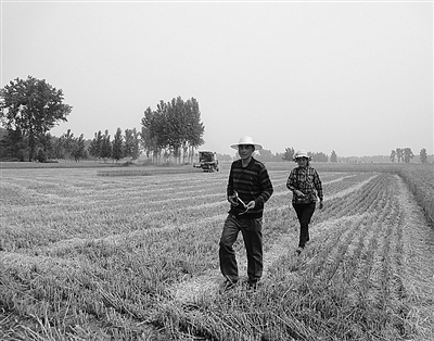5月30日,麦客高安青夫妇在刚收完的麦地里丈量面积,每亩55元机收费,他们一天可收割60亩小麦。