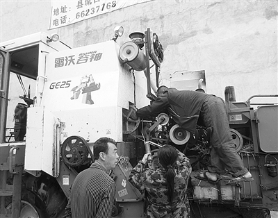 5月31日,麦客李仁军夫妇趁着闲暇时间在检修收割机,为机器作保养。 本报记者 乔金亮摄