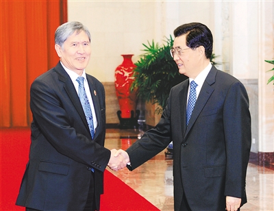 新华社北京6月5日电 (记者刘东凯) 国家主席胡锦涛5日上午在人民大会堂同来华访问并出席上海合作组织峰会的吉尔吉斯斯坦总统阿坦巴耶夫举行会谈。