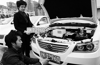 2011年4月6日,在上海嘉定区安亭镇工作的黄女士为自己的纯电动汽车挂上沪牌,成为上海首批纯电动汽车私家车主之一。 本报记者 李治国摄